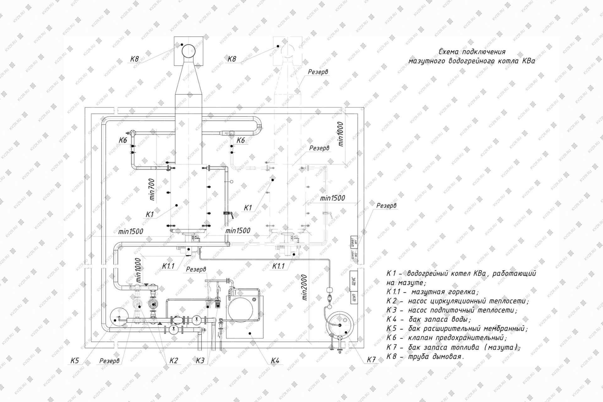 К вспомогательному оборудованию при подключении промышленного водогрейного котла КВа на мазуте относят - щит управления котлом, горелку импортного или отечественного производства, насос циркуляционный, насос подпиточной воды, регулятор давления газа (по необходимости), бак запаса воды, расширительный мембранный бак, газоходы и переходники для газового тракта, дымовую трубу.