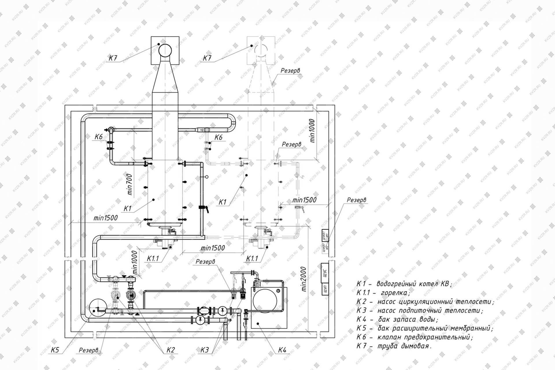 Для котельных 1 категории, являющиеся единственным источником тепла системы теплоснабжения и обеспечивающие потребителей первой категории, не имеющих индивидуальных резервных источников тепла, необходимо предусмотреть полное резервирование оборудования – подключение 2 (двух) котлов, насосов, ТДМ. Пунктиром обозначено оборудование для резервирования.