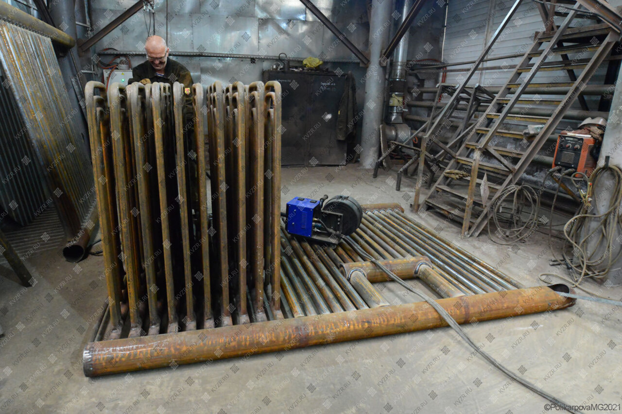 Блок водонагревательного котла КВм 0,6 МВт представляет собой горизонтальную стальную сварную конструкцию, состоящую из трубной системы (радиационной и конвективной поверхности нагрева), опорной рамы и каркаса с теплоизоляционными материалами, обшитого листовой сталью. Топочная камера состоит из труб Ø 57x3,5 мм. Конвективная поверхность нагрева состоит из пакетов выполненных из труб Ø 32x3 мм, для интенсификации теплообмена трубы пакетов расположены в шахматном порядке.