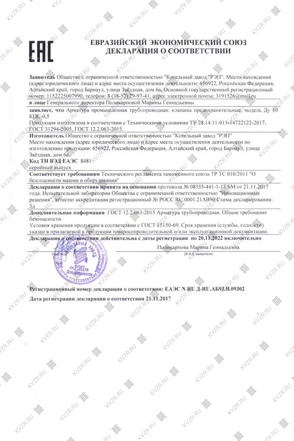 Получена декларация о соответствии на клапаны предохранительные КПС-0,5