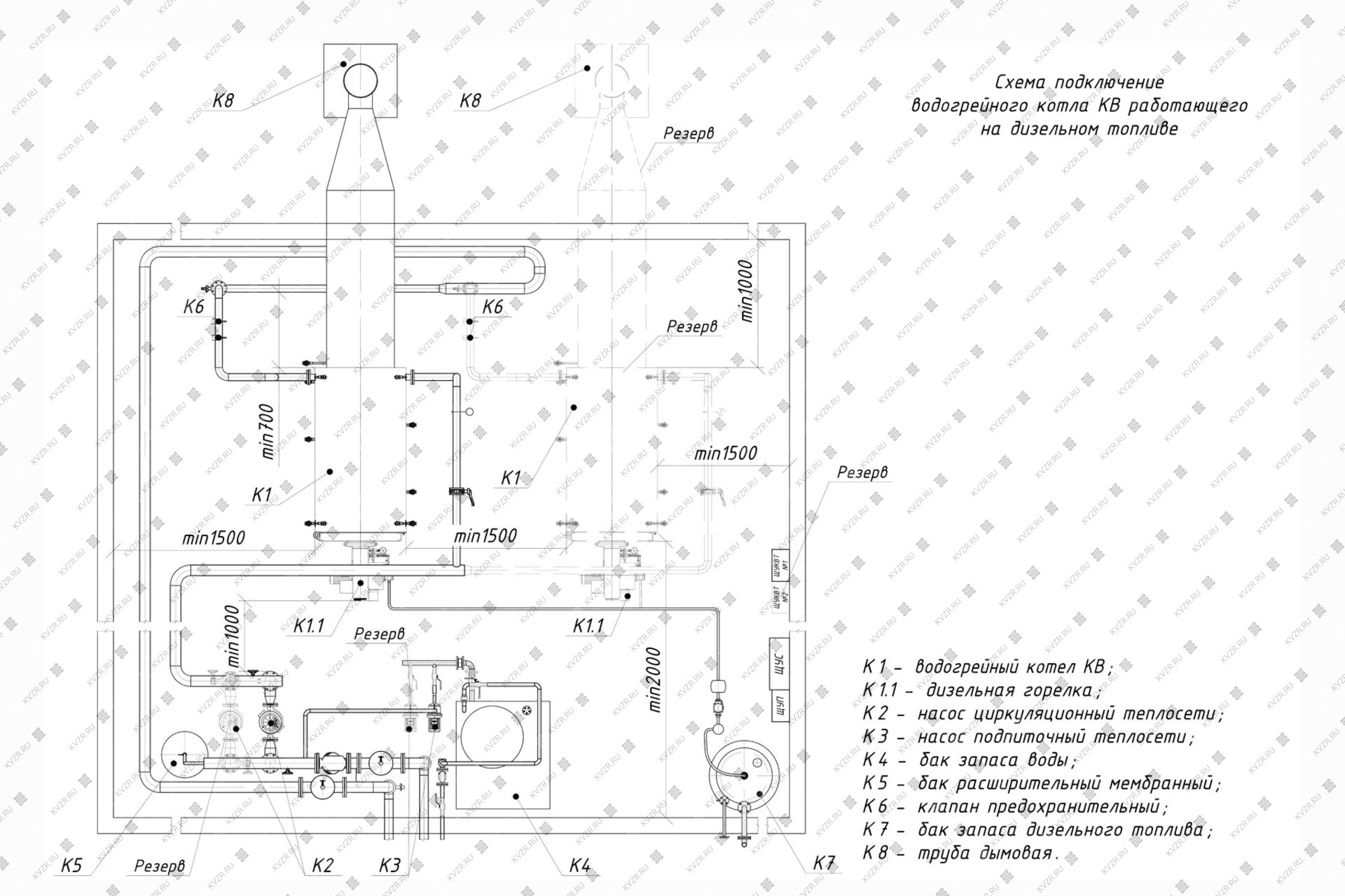 Чтобы правильно подключить котел 0.25 МВт на дизеле в котельной необходимо оставить проемы для обслуживания оборудования во время эксплуатации. На представленной здесь схеме указаны их минимальные размеры. Кроме того, в данной примерной схеме монтажа водогрейных котлов и оборудования указан перечень минимально необходимого вспомогательного оборудования для правильной работы котла.