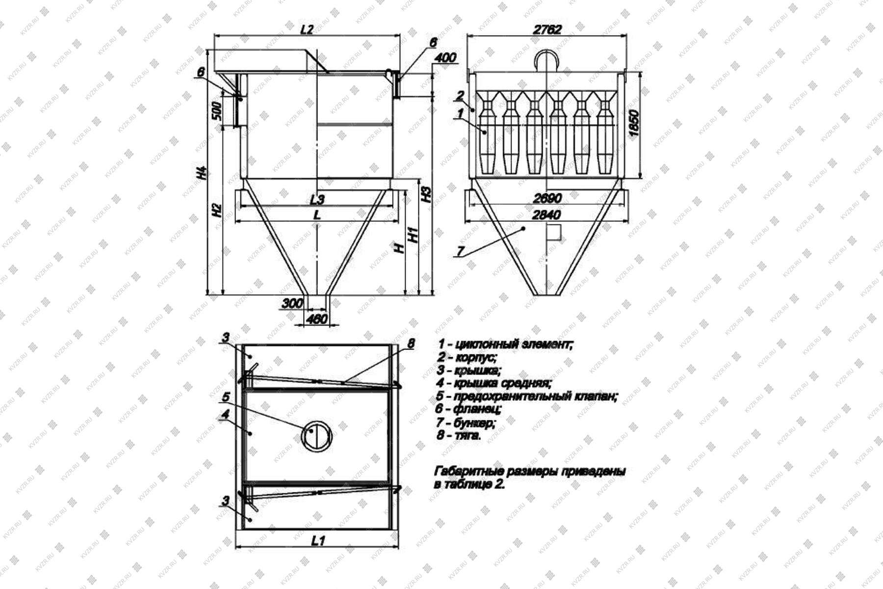 Агрегат БЦ 2 состоит из параллельно установленных чугунных циклонных элементов, объединенных в одном корпусе и имеющих общие подвод и отвод газов, а также сборный двухсекционный бункер.