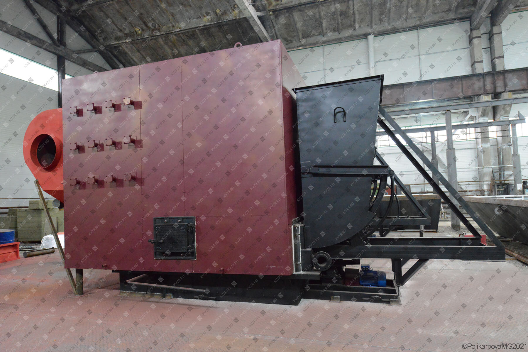 Водогрейные котлы промышленные с топкой ЗП РПК устанавливаются в котельных с механическими топливоподачей и шлакоудалением. На фронте установлена плита для крепления забрасывателя, на фронте и на боковой стенке агрегата установлены дверки для обслуживания топки и контроля процесса горения. Топливо по неподвижной колосниковой решетке разбрасывается с помощью вращающихся лопастей забрасывателя.